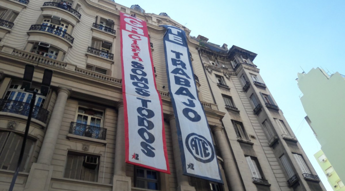 En las puertas del Ministerio, Pablo Viñas -secretario general de la Comisión Interna- contrastó el desaire de Triaca con el recibimiento de los trabajadores del ministerio que desplegaron dos gigantescas banderas que vistieron el edificio con el lema «AGR-Clarín somos todos», firmada por ATE-Trabajo.