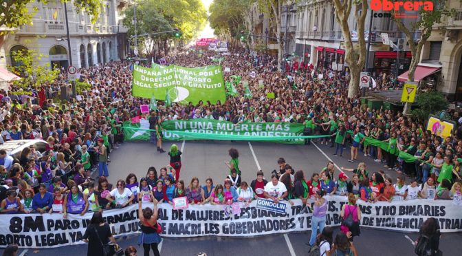 “Aborto legal ya. No al ajuste de Macri, les gobernadores y el FMI. Basta de violencia patriarcal”. Detrás de una bandera de arrastre con estas consignas, decenas de miles de mujeres marcharon de Congreso a Plaza de Mayo en el marco del paro internacional con el que se conmemora el Día de la Mujer Trabajadora en todo el mundo. Al frente de la marcha se encontraban las representantes de las organizaciones de mujeres, de la juventud y de los movimientos LGTB+, de los sindicatos combativos y de las luchas obreras.
