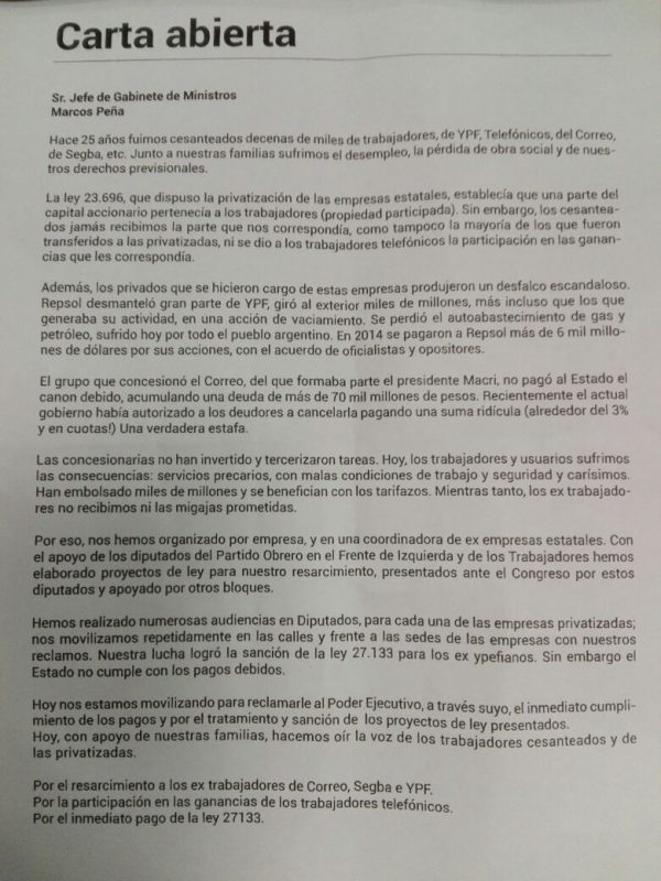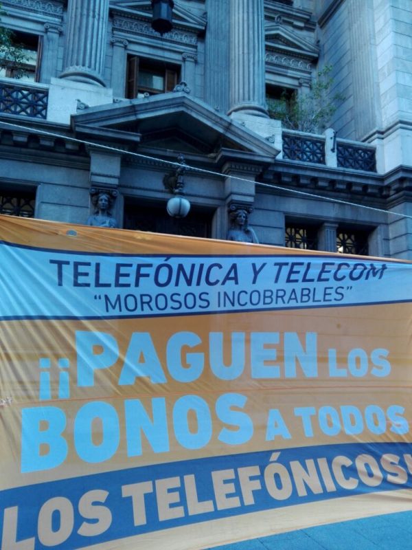El 30/09 realizamos una radio abierta en la puerta del Congreso por el pago de los Bonos de participación a todos los telefónicos, mientras adentro del Congreso se desarrollaba la interpelación al jefe de gabinete, Marcos Peña, a quien los diputados plantearon el reclamo.En la puerta del Congreso con una radio abierta se entregó una Carta Abierta (adjuntamos abajo) a Marcos Peña, entregada a todos los diputados. Explicando el reclamo de los telefónicos y también de los trabajadores y ex trabajadores de YPF, del Correo, Segba (Luz y Fuerza) y las privatizadas que realizaron un saqueo de los recursos económicos y naturales mientras incumplieron los compromisos con los trabajadores (PPP – Programas de Propiedad Participada y pago anual de los Bonos de participación en las ganancias).Por la Naranja Telefónica intervino Pablo Eibuszyc (Vocal de la comisión directiva de Foetra por la minoría) llamando a impulsar este reclamo en el congreso y en la calle, de cara al gobierno y las empresas para instalar la discusión por esta reivindicación histórica en momentos en que avanza una megafusión de Telecom con Cablevisión, que deja pendiente este y otros reclamos del gremio.En la radio abierta hablaron también los 4 diputados del Frente de Izquierda (Soledad Sosa, Pablo López, Natalia González, Juan Carlos Giordano) y envió su adhesión la diputada Alcira Argumedo. También participó la Dra. Liliana Zabala (adjuntamos audio con su intervención) que lleva adelante miles de juicios y logró el fallo Gentini en la Corte Suprema que declaró la inconstitucional del decreto menemista (decreto 395/92) por el cual las empresas quedaban eximidas del pago de los Bonos. La inconstitucionalidad (ilegalidad) de este decreto plantea la obligación de las empresas de pagar los Bonos, motivo por el cual presentamos el “proyecto Pitrola” para reglamentar el pago y resarcimiento por los Bonos adeudados. La ausencia de una lucha real de la mayoría de las direcciones sindicales de los telefónicos (Foeesitra, Foetra/Fatel) permite a las empresas estirar los juicios indefinidamente y limitar los mismos con un fuerte lobby patronal.Hay que volver a colocar el reclamo de los Bonos de cara a la discusión nacional, en momentos en que avanza el “cuádruple play” y la megafusión de Telecom con Cablevisión.
