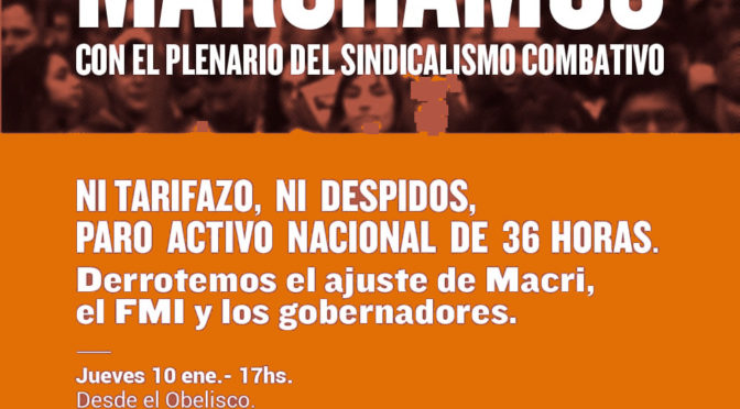 Los sindicatos, seccionales, comisiones internas y agrupaciones integrantes del Plenario Sindical Combativo, que nos hemos pronunciado contra el plan de guerra de Macri, y los gobernadores y que decimos NO al pacto con el FMI, planteamos que necesitamos un inmediato paro activo y plan de lucha, que ponga en pie a la clase obrera para enfrentar este ajuste que ni la CGT ni las CTAs ponen en marcha.