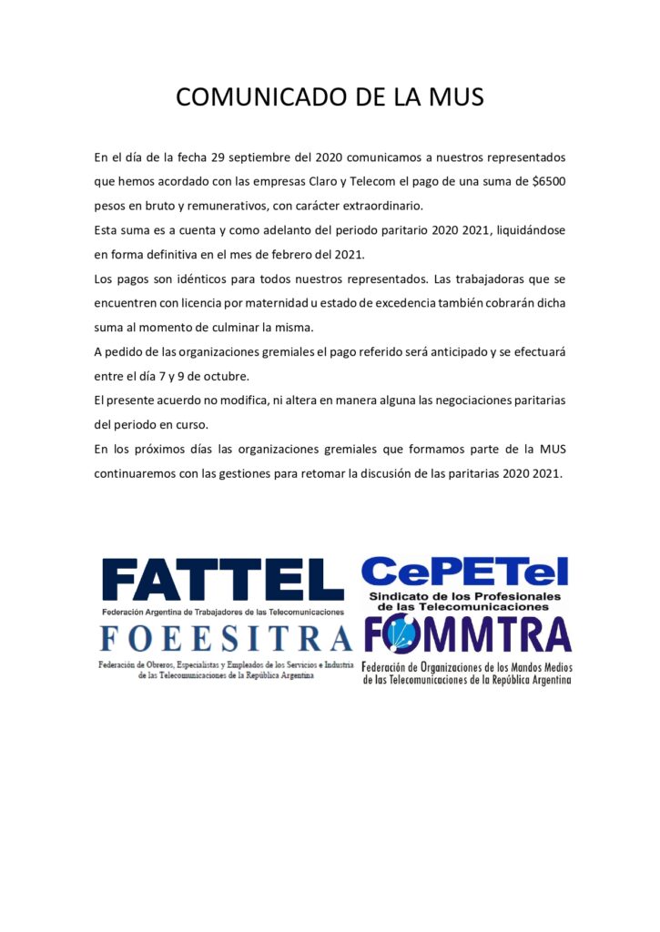 El 30/09 Telecom firmó con el SATSAID, Sindicato de Televisión que encuadra a los trabajadores de Telecom que provienen de Cablevisión, un acuerdo que otorga un 3% retroactivo a Agosto y 4% a partir de Octubre. Es decir, 7% sobre los sueldos de Junio, por los primeros 4 meses del año, y la promesa de una nueva reunión en Noviembre.