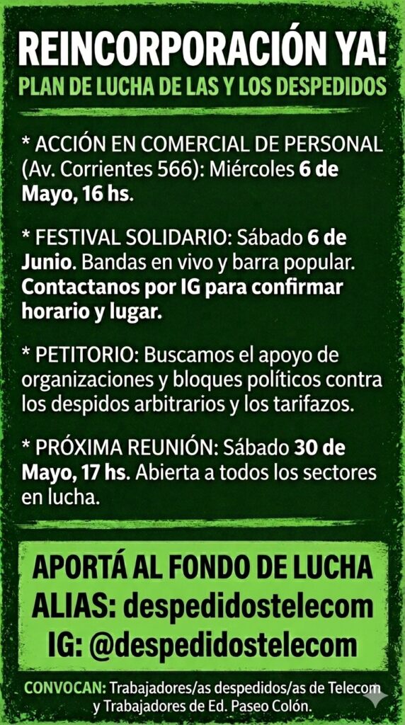 LOS TELEFONICOS SALIMOS A LUCHAR Posted on 29/04/2026 por admin Reincorporacion de los trabajadores despedidosBasta de aprietes Visitas: 0