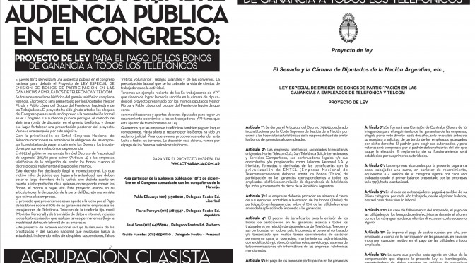Damos difusión a un proyecto de Ley elaborado por compañeros de la Naranja Telefónica y presentado por los diputados Néstor Pitrola y Pablo López del bloque Frente de Izquierda y de los Trabajadores (Partido Obrero) que ponemos a consideración de todo el gremio. El objetivo es iniciar una ronda de discusiones para posteriormente presentarlo formalmente en el Congreso. Esta iniciativa la realizamos como un aporte al reclamo por el pago de los Bonos de Participación sobre el 10 % de las ganancias de las empresas a todos los trabajadores de la telefonía fija, móvil y datos.
